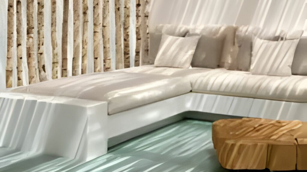 “Touche exotique. Douche ouverte traitée en béton ciré par Marius Aurenti, robinetterie Grohe, carrelage sol en céramique Wow. Design fauteuil réalisé sur-mesure en Inde, globe papillon chiné chez Ghislam Antiques à Saint-Ouen.”