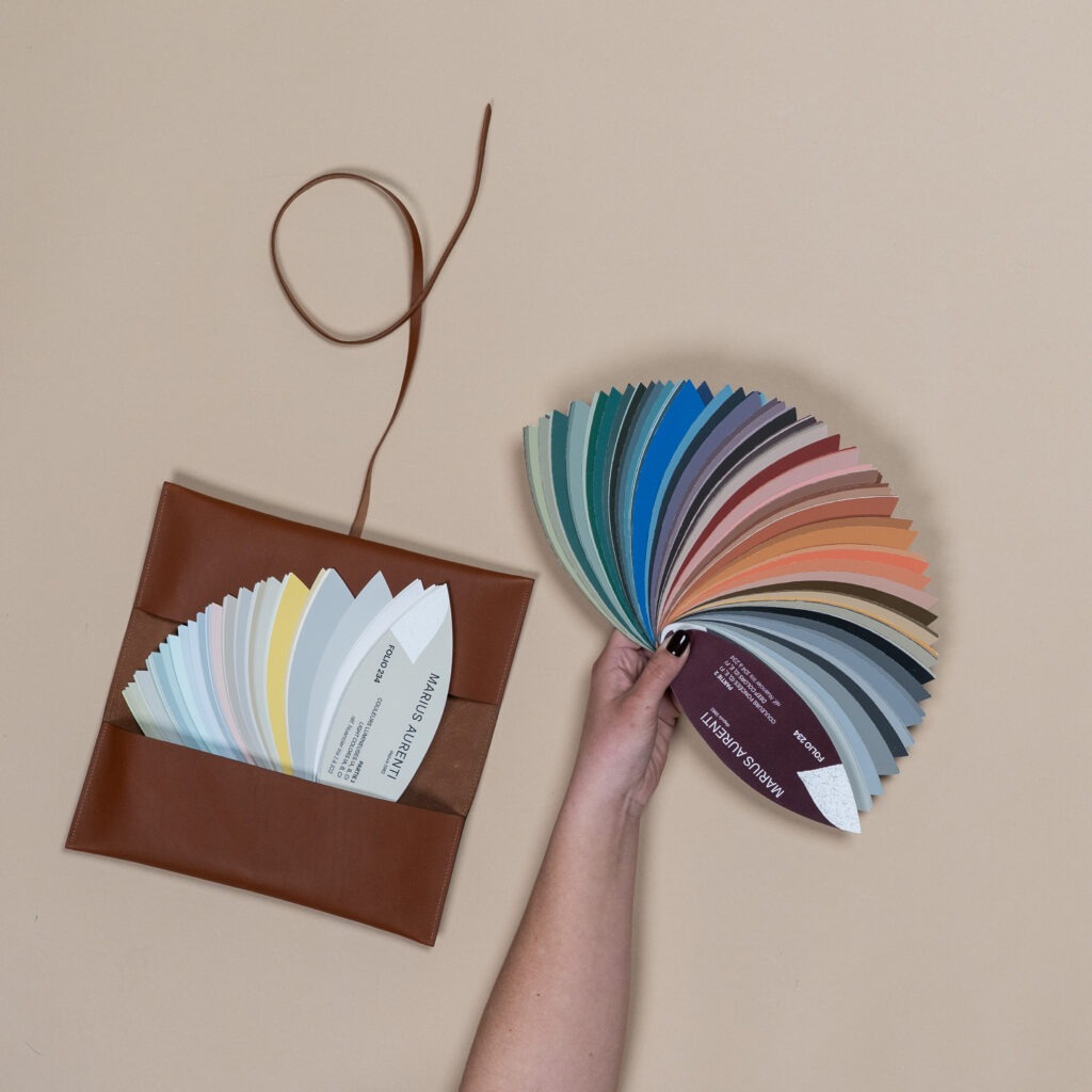 Réalisée à partir de cuirs de maroquinerie de haute qualité et élaborée en collaboration avec un centre d’accompagnement de travailleurs handicapés, cette pochette allie exigence esthétique, engagement humain et robustesse. Conçue pour un usage intensif sur le terrain, elle protège durablement le nuancier et se patine naturellement avec le temps, renforçant son caractère unique.