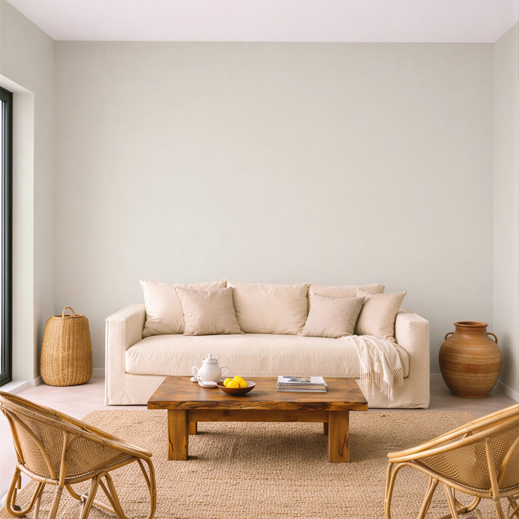 La surface polie des coquillages façonnés par la mer inspire cette teinte claire. Entre blanc et beige, elle laisse apparaître une infime nuance verte qui lui donne une vibration très naturelle. Une couleur minérale et lumineuse qui accompagne facilement pierre, chaux ou bois clairs.
