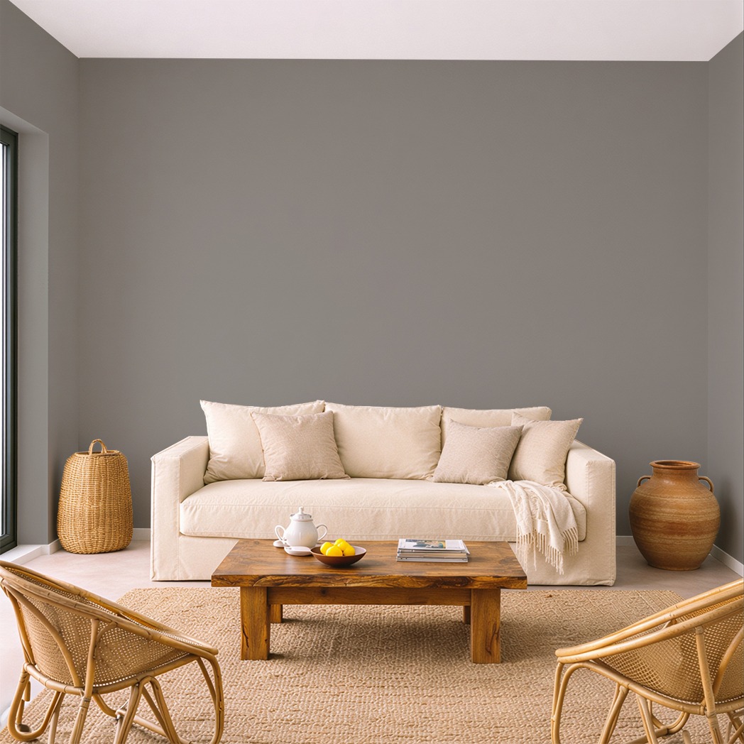 La peau de l’éléphant présente une surface épaisse, mate et nuancée. La teinte reprend cette profondeur par un gris soutenu mais tempéré. Elle donne de la structure à un espace tout en restant suffisamment neutre pour dialoguer avec une grande variété de couleurs.