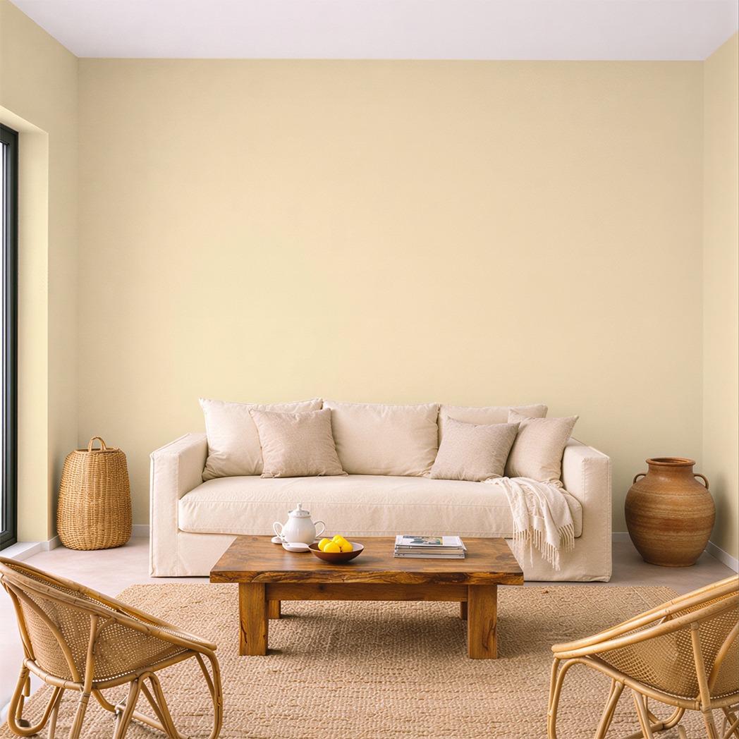 Évoquant les mouillettes de pain plongées dans un œuf à la coque, la teinte rappelle un jaune pâle et gourmand. La couleur possède une douceur familière presque enfantine. Elle apporte chaleur et convivialité à une pièce tout en restant légère.
